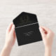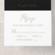 Elegant black all-in-one wedding invitation featuring your monogram initials inside a vintage wedding crest, your names, "Reception to follow" and "Rsvp" showcased in a chic calligraphy script, your invitation details in classic serif typography, and a white tear-away RSVP response postcard, all rendered in your choice of genuine gold, silver or rose gold foil. If desired, you can adjust the size of the script for longer or shorter names by editing in the design tool.