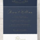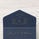 Elegant deep navy blue wedding invitation that features your monogram initials inside a wedding crest, your names, "Reception to follow" and "Rsvp" showcased in a chic script, your invitation details in classic serif typography, and a white tear-away RSVP postcard, all rendered in your choice of genuine gold, silver or rose gold foil. If desired, you can adjust the size of the script for longer or shorter names by editing in the design tool.