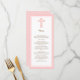 An elegant cross designed with swirling curls and fancy fleur de lis patterns, coordinates perfectly with our baptism, communion and confirmation invitations. Each line can be customized for your menu. Pretty pink cross design is available in matching stickers and postage as well.