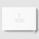 Cet élégant livre d'or en feuille de papier fait un luxueux gardien pour une mariée et un marié et est une belle façon pour les invités mariages d'express leur appréciation. La couverture avant et la couverture arrière du livre d'or présentent la croix en véritable feuille métallique. Il y a du vrai texte en feuille métallique sur la couverture avant, sur la colonne vertébrale et sur la couverture arrière du livre d'or; le texte est facile à personnaliser en ligne avant de commander.
