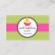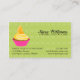 © 2012 Socialite Designs. Promote your bakery business with the cute and colourful cupcake business cards. Our design has an orange slice cupcake inside a pink cup. Your business text goes inside a whimsical scalloped circle and finished off with a pink polka-dot ribbon.