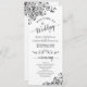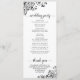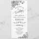 This beautiful wedding program features an elegant black and white design with lacy curls and swirls in the corners. The titles are written in fancy script calligraphy, and there is space for your ceremony and wedding party details, as well as a short thank you for your guests. Wonderful way to welcome your friends and family to your wedding celebration.