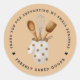 Modern custom bakery thank you sticker. A cute wooden utensil brown polka dot potholder set in the centre of the sticker, thank you for supporting my small business is above it and below it is the name of the business.