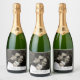 Modern sparkling wine Photo Labels. This design features of bride and grooms photograph and black text with their names, date and location of the wedding.