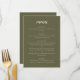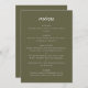 This customizable printed menu in olive moss adds a sophisticated and polished touch to your dining experience. Featuring a clean layout with elegant calligraphy at the top, it lists the appetizer, starter, main course options, and dessert in an easy-to-read format. Perfect for weddings, rehearsal dinners, or any formal event, these menus guide your guests through the delicious selections planned for your celebration while enhancing your table settings. Pair them with coordinating table decor for a seamless and refined aesthetic.