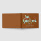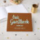 This generic guest book features the messages "Our Guestbook" and "PLEASE SIGN", along with a personalized date. The text is coloured turquoise, and the background is coloured brown. A generic, customizable guest book like this might be used at an event such as a baby shower, a wedding, a funeral, or some other event.