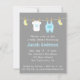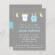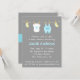There is something just so cute about mini baby clothes and accessories! And that makes it a wonderful and attractive design for an adorable baby shower invite. This modern design includes cute baby items like yellow baby socks, a white baby jumpsuit with a blue prince crown and a pastel blue overalls with pocket hanging on a clothesline with wooden pegs. Reverse page includes a blue banner that reads "It's a boy!". Pastel colours just stands out on the grey background and gives an elegance to it. Personalise easily with your party details.