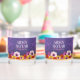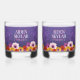 Make your special day an unforgettable celebration with these floral-themed wedding stemless wine glasses, which feature elegant white lettering with lavender purple confetti and colourful African daisies on a violet purple to black background. Customize with the newlyweds' names, wedding date, and/or congratulatory message. Reverse shows identical design.