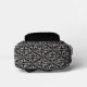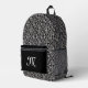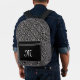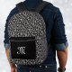This backpack has an elegant damask pattern done in black and white. It has white fancy scrolls on black. The front pocket is black where you can customize your initial or text with the template.