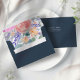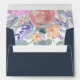 An elegant dark blue envelope, beautifully enhanced with an interior featuring original watercolor florals and eucalyptus in soft shades of purple, peach-orange, and rich green. The delicate botanical design adds a romantic, artistic touch that pairs perfectly with the warm peach exterior. Finished with a personalised return address on the reverse, this envelope adds a sophisticated layer to your wedding stationery suite, making a lasting impression from the very first moment.