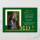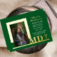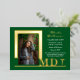 Classy and elegant one photo gold text "MD" caduceus physician graduation announcement design with real foil details by Holiday Hearts Designs (rights reserved). Placeholder template photo courtesy Unsplash.