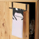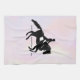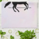 A kitchen towel with a black and white illustration of a dressage rider. The horse and rider are performing a pirouette. Classy and beautiful. Set on a watercolor background in delicate and muted pastel colours.