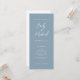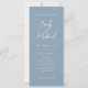 Our elegant slim wedding program card is perfect for your minimalist wedding celebration. A beautiful white calligraphy script font paired with simple and clean text sits on a soft blue background to the front of the card. The white reverse has tonal blue text, creating an elevated look to complement your stylish event. Easy and quick to customize yourself with your own wedding details.