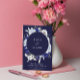 This elegant save-the-date card features a navy blue background with a dusty blue and white floral wreath framing the centre. The text is simple and classic, using a white font that stands out against the dark background. The overall design is clean and sophisticated, making it a perfect choice for a formal or upscale wedding.
