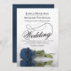 This beautiful wedding invitation features a gorgeous photograph of a single long stemmed dusty blue grey coloured rose lying on its side reflecting in a pool of water with waves and ripples. The design features a fancy calligraphy script with a long curly tail making it both modern and classic. Elegant, sophisticated and chic way to invite your friends and family to share in your special day. The back of the card is a marbled blue grey or pewter colour with a plush pattern.