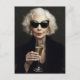 A sophisticated elderly woman with platinum curls, wearing dark sunglasses, luxurious jewellery, and a black fur coat, elegantly holding a glass of champagne.
