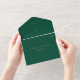 A modern elegant all in one monogram wedding invitation features an emerald green card with gold typography. This invitation is perfect for those who desire a simple yet elegant wedding. Your guests simply tear off the RSVP which has been preprinted with your return address and mail it back to you. You can handwrite your guests name and mailing address on the front of the card