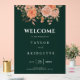 Un mariage vert émeraude accueille un panneau acrylique avec des accents boho chic floral de roses de pivoine et d'herbe pampas. Simple à personnaliser avec les détails de votre mariage pour vos invités dans une élégante typographie minimaliste.