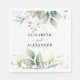 Romantic floral wedding paper napkins that feature a delicate botanical bouquet of light and airy watercolor greenery and eucalyptus leaves complemented with glittery golden speckles (printed) and are easily customizable with your names.