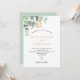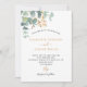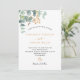 A chic white background. Decorated with green watercolored eucalyptus leaves, sprigs, greenery and a faux gold sprig. Personalize and add your names and wedding details. Black and golden letters.