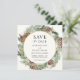 Élégant faire-part de mariage sur le thème de l'hiver avec un cadre doré entouré de feuillage persistant aquarellé et de pommes de pin. Personnalisez avec vos informations ou cliquez sur "Cliquez pour personnaliser davantage" pour modifier les styles de police, la taille et les couleurs.