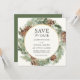 Faire-part de mariage sur le thème de l'hiver élégant avec un cadre doré entouré de branches d'evergreen et de pommes de pin aquarelles. Personnalisez avec vos informations ou cliquez sur "Cliquez pour personnaliser davantage" pour modifier les styles de police, la taille et les couleurs.