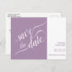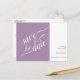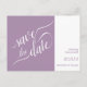 Ces cartes de faire-part sont simples, élégantes, modernes et stylées. Elles présentent un design à 2 volets avec une calligraphie élégante en script indiquant "sauver la date" sur le volet gauche de couleur lavande ou violet poussiéreux. Le volet droit est blanc et comporte un espace pour vos noms avec la date et le lieu du mariage dans une mise en page unique justifiée à droite. Il y a un espace facultatif pour une URL de site Web au verso où vos invités pourront obtenir plus d'informations.