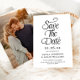 Cette élégante carte de faire-part de mariage comporte un fond blanc classique avec une écriture manuscrite "Sauver la date" et une typographie classique en noir. Au verso se trouve votre photo en plein cadre (alias "fond perdu"), qui peut également être supprimée si vous le souhaitez. Ce design donne une première impression élégante et chic pour votre mariage ! Le fond, le texte et le message sont personnalisables.