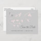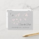 Élégantes et modernes cartes de faire-part SAVE THE DATE à envoyer à vos invités. Calligraphie de script gris avec des feuilles délicates de rose blush (branche). Couleur de fond gris. Modèles personnalisés en ligne pour faciliter l'édition. Ajoutez votre texte à l'avant et à l'arrière de la carte. Contactez le designer pour des demandes spéciales.