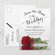Ces jolies cartes postales sont un excellent moyen de faire savoir à vos amis et à votre famille de réserver la date de votre mariage imminent. Le design présente une magnifique rose rouge à longue tige allongée sur le côté se reflétant dans une mare avec des vagues et des ondulations. Le texte présente une calligraphie à l'écriture délicate et dentelée. Le verso comporte un graphique mignon indiquant "prenez note" avec un espace pour une note personnalisée qui peut inclure votre site web de mariage.