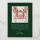 Voici notre Faire-part de naissance photo Elegant Green and Gold Foil Bow, une façon étonnante de célébrer l’arrivée de votre petit. La photo du bébé est magnifiquement encerclée par un ruban doré attaché dans un arc sur un arrière - plan vert de pin. Le prénom et le deuxième prénom de votre bébé apparaissent en calligraphie élégante, avec le nom et les statistiques de naissance ci-dessous. L'arrière de la faire-part offre de l'espace pour une photo supplémentaire et un message personnel. Ce gardien luxueux et personnalisable est parfait pour partager votre joie avec votre famille et vos amis!