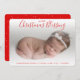 Annoncez la naissance de votre nouveau bébé garçon ou fille avec cette carte photo moderne avec le message, "Notre petite bénédiction de Noël" dans une élégante police d'écriture rouge en haut. Ajoutez le nom et les statistiques de naissance de votre bébé en bas. Utilisez le modèle pour ajouter votre propre message personnel à l'arrière.