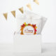 Make this Thanksgiving a truly unforgettable experience by adorning your favours with a bag that speaks from the heart and captures the warmth of the occasion. The refined, artisanal script perfectly complements the sleek, contemporary sans-serif in this harmonious blend of modern fonts. You will see an intricate mosaic of maple leaves nestled within a white circle with a delicate touch of crimson, representing autumn's vibrant colour palette - a graceful transition from brilliant golds to blazing reds and warm, earthy browns. What sets our favour bag apart is the ability to tailor it to your unique style and sentiment. With customizable options, you can add your family name, a heartfelt message of thanks, or a memorable quote that resonates with the spirit of Thanksgiving.