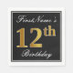 This simple and elegant paper napkin design features a message like "FirstName’s 12th Birthday" (with the "12th" having a faux gold-like colouring) within a black-coloured square area featuring a simple border outline. The name is in a white-coloured script-like text, and can be personalized. Napkins like these could perhaps be used at a birthday party for somebody who is celebrating their twelfth birthday. [~Z0000136]