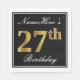 This simple and elegant paper napkin design features a message like "NameHere’s 27th Birthday" (with the "27th" having a faux gold-like colouring look) within a black-coloured square area featuring a simple border outline. The name is in a white-coloured script-like text, and can be customized. Napkins like these could perhaps be used at a birthday party for somebody who is celebrating their twenty seventh birthday. [~Z0000136]