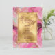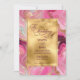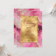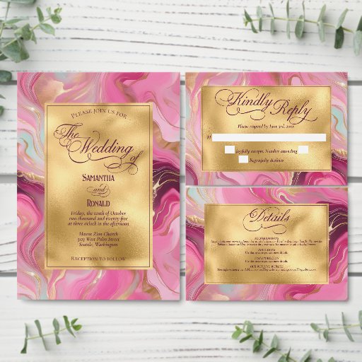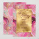 A wedding invitation featuring a faux gold and pink marbled design.