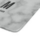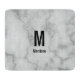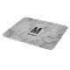 This elegant faux grey marble cutting board has text in the centre. There's a large dark grey letter that you can replace with your own monogram. Under the initial, there's grey display text for a name or a custom message. The text is black. A personalized cutting board makes a lovely housewarming present or gift for newlyweds.