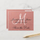 Elegant Faux Rose Gold Foil and Black Save the Date postcard. Elke Clarke© for MonogramGallery at Zazzle. Modern, simple wedding announcement with printed rose gold foil photo effect. A white monogram initial in script typography with black text overlay. Fully customizable. Other colours and background effects available.