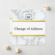 Do you need to make a moving announcement? A white marble texture look background can be customized with your monogram, name and new address. At the top there's a square for your monogram. On front, there's customizable black text (shown:'Change of Address'). On back, is a white background for your name and new address.