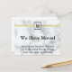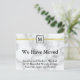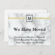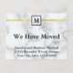 'We Have Moved' appears in bold black text in the centre of this white marble look announcement. Within a small square at the top of the sticker you can personalize your change of address cards with your monogram. At the bottom you can indicate your change of address with your name and new address.