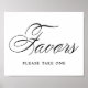 This beautiful and timeless horizontal "Favors: Please Take One" table signage adds a simple elegance to any classic wedding reception, shower or party motif. The luxurious script design features a whimsical and romantic modern black calligraphy lettering. The lovely font with a customizable background color makes it easy to fit any theme. For other colors or matching products, please visit the JustFharryn Zazzle store, or contact the designer, c/o Fharryn@yahoo.com All rights reserved. #zazzlemade