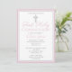 Celebrate this special milestone with a beautifully modern First Holy Communion invitation. This design features a simple silver cross against a white background with a pink border. Design the perfect girl's First Communion invitation by customizing the colour, font, date, and all text details.