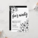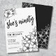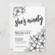 Floral Ninetieth Black White 90th Birthday Party Invitation. A fun but elegant 50th birthday party invitation with black and white flowers for the young at heart. Please note that the gold will not have any actual shine to it, it's simply a colour. A playful flower pattern frames a script typography "she's ninety" mixed with a more classic serif font. Celebrate ninety years of life with this beautiful botanical design. The fun part is you can change out ALL of the colours!! You can not only change the background colours and font, but you can change the lines for the flowers as well.