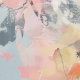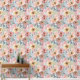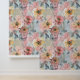Elegant wallpaper featuring muted pink, yellow and orange floral abstracts on a blue and sage green background.