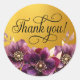 Add a touch of timeless elegance to your event with our Elegant Floral Gold Script Thank You Sticker. Perfect for sealing favour bags, decorating gratitude gifts, or enhancing your party packaging, this exquisite design features rich purple and deep red floral elements, accented with delicate gold detailing. The luxurious gold script "Thank You" stands out beautifully, enhanced by graceful decorative swirls that evoke sophistication and charm.