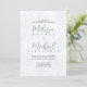 This design features a elegant floral blue calligraphy script wedding invitation with a stylish trendy calligraphy script text, a classic classy modern minimal, a stylish greenery foliage leaves leaf, a soft romantic garden rose flower, a traditional formal stationery suite, with calligraphy ampersand monogram back, bride and groom initials back, with dusty blue colour theme, with hand drawn artwork handdrawn original