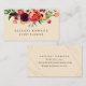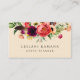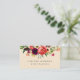 Elegant watercolor bohemian style flowers, feathers and foliage in chic shades of purple, burgundy, pink, peach and green with gold geometric accents on back, business cards. Background colour, shown in champagne, can be customized.