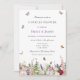 Summery, elegant and modern, this couples shower invitation features a botanical garden of watercolor pink and purple flowers including roses, tulips, lavender and eucalyptus greenery with bright coloured butterflies and bumble bees flying around.