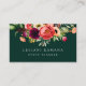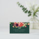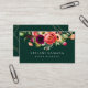 Elegant watercolor bohemian style flowers, feathers and foliage in chic shades of purple, burgundy, pink, peach and green with gold geometric accents on back, business cards. Background colour, shown in emerald green, can be customized.