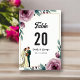 This elegant watercolor floral wedding table number is perfect for a modern wedding. The romantic design features an elegant watercolor floral frame with a bride and groom illustration and black calligraphy on a white background.